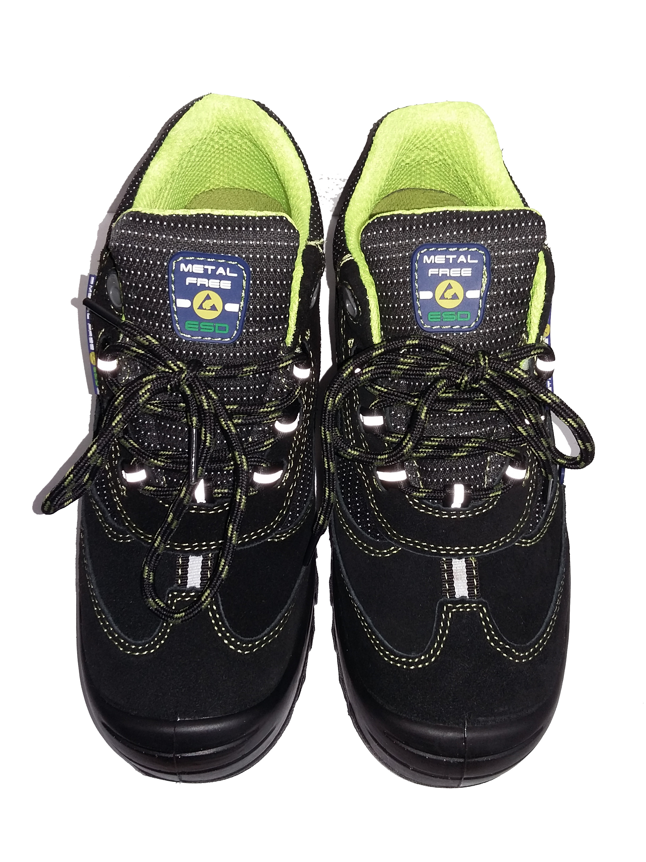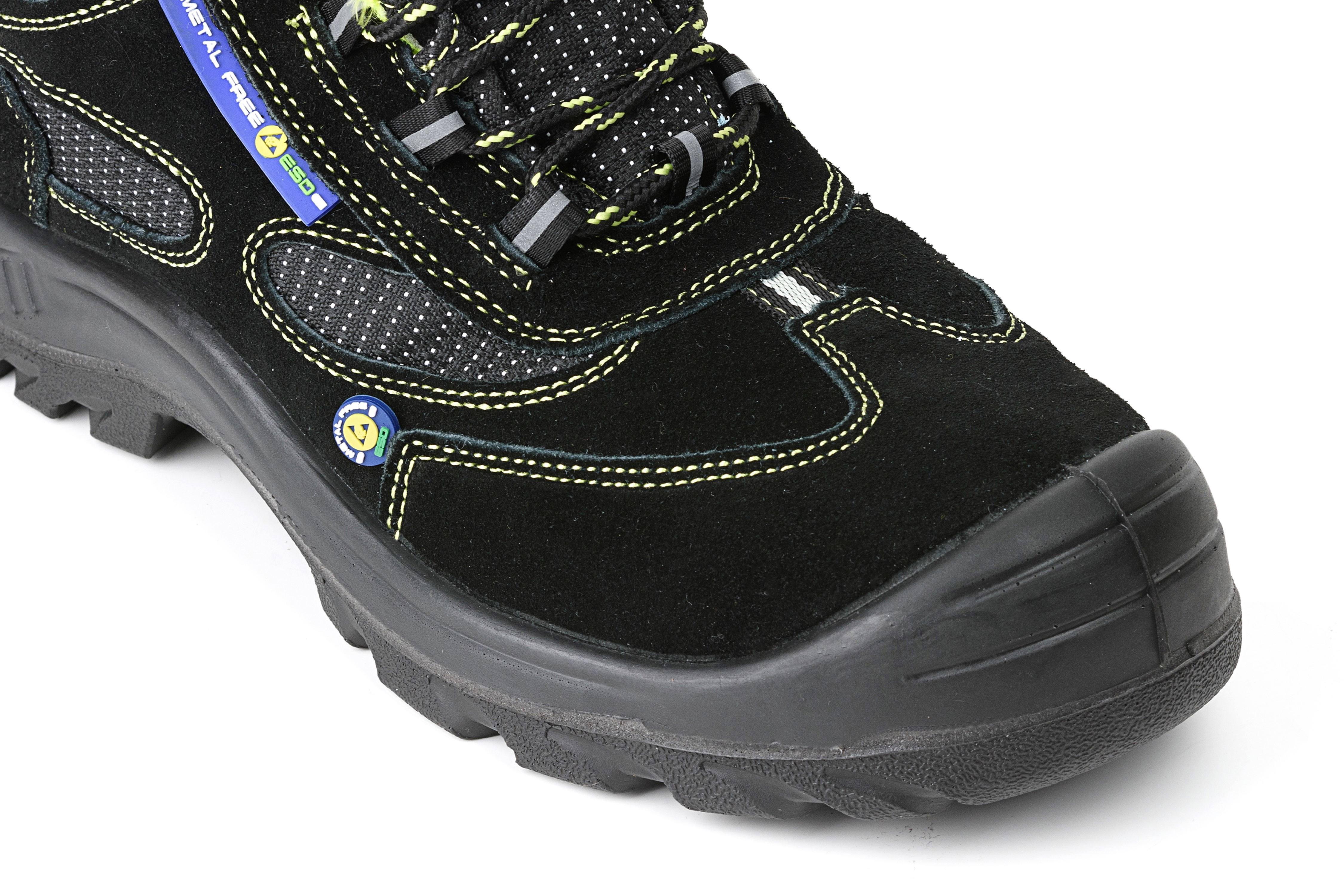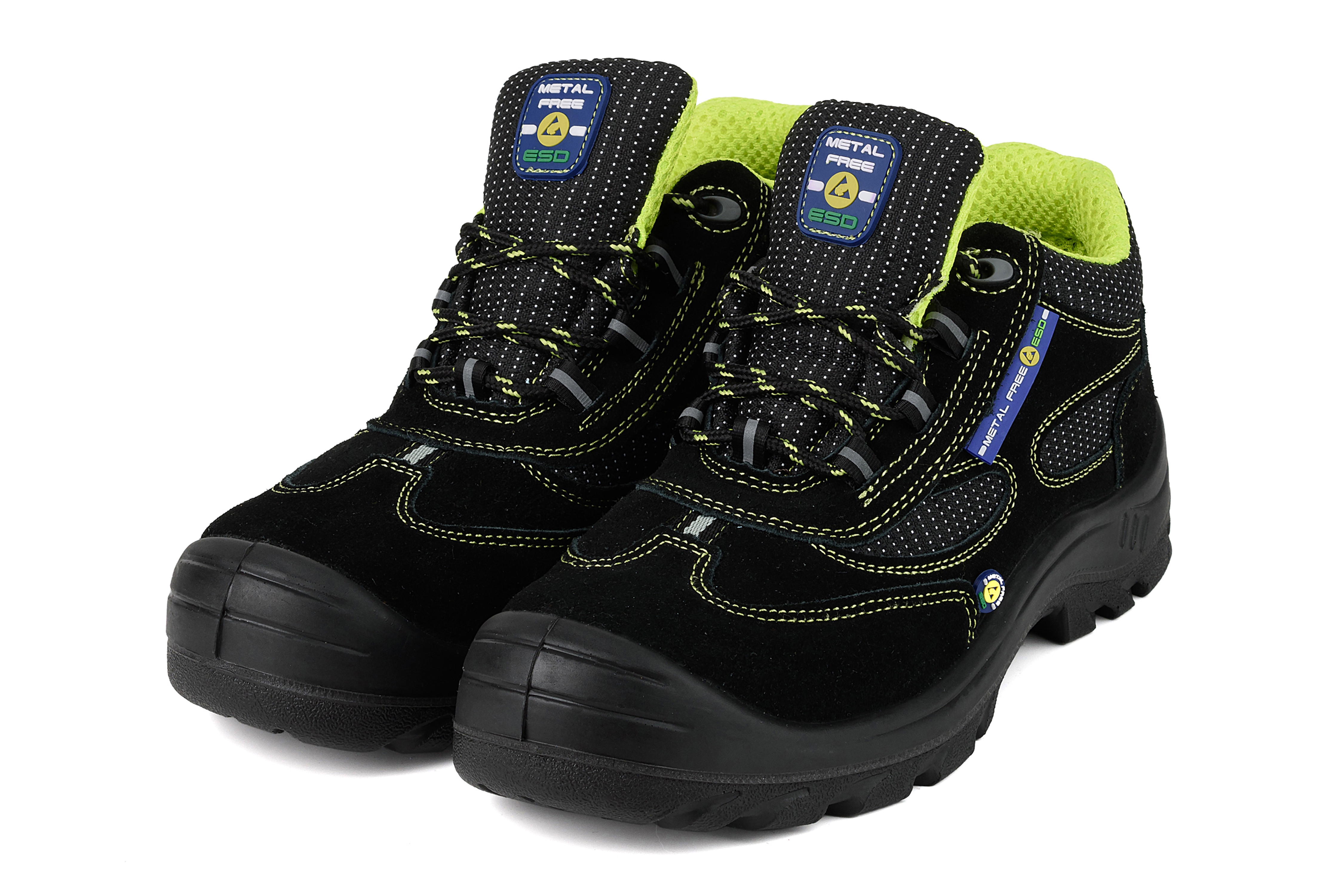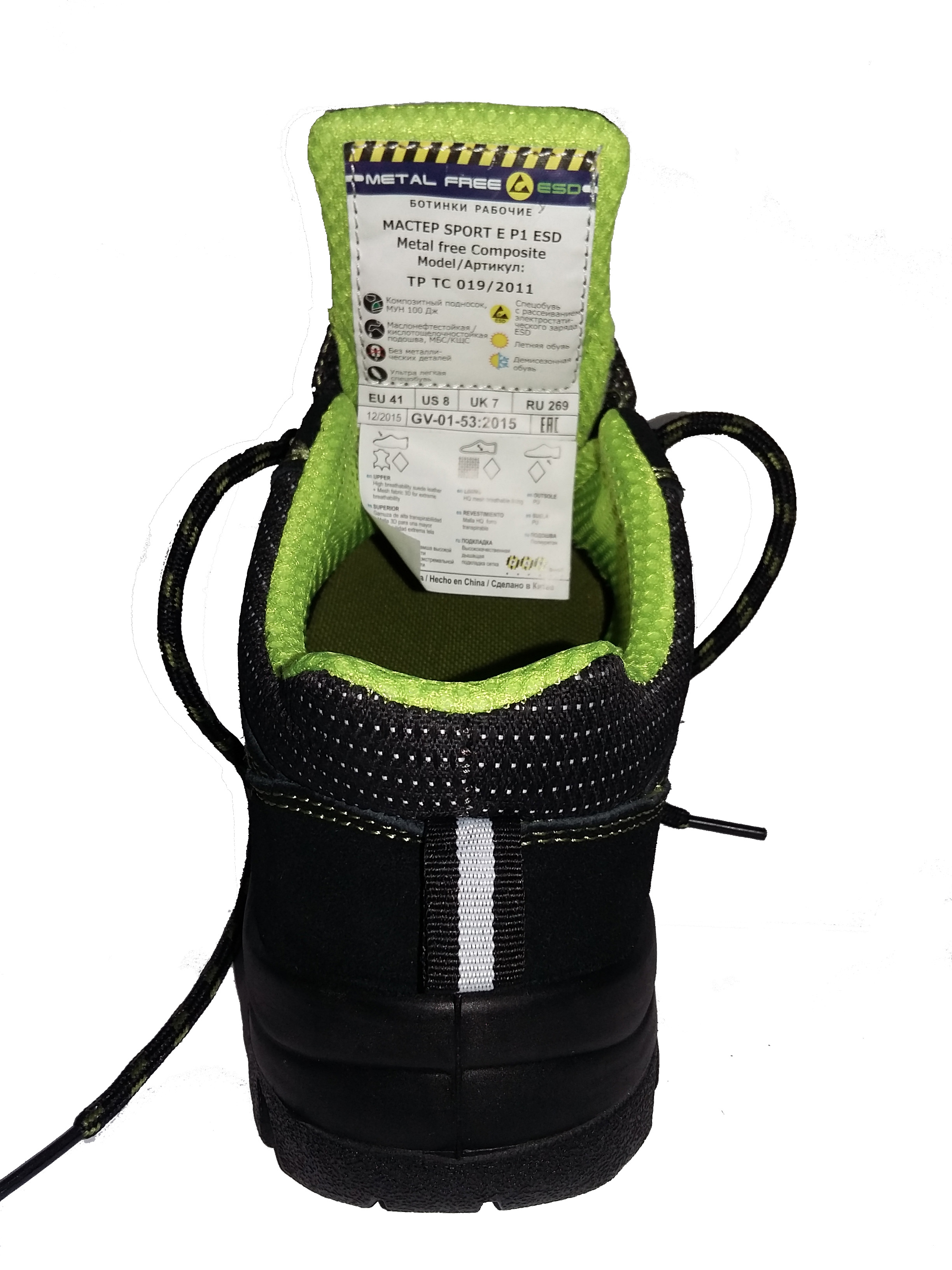 Особенности модели: комфортная широкая колодка, ПУ-накладка для защиты носка, энергопоглощающий каблук, формованный задник, спортивная пятка. Спецобувь без металлических деталей. «ESD» — с эффектом рассеивания электростатического заряда, глухой клапан, антистатичная вкладная стелька